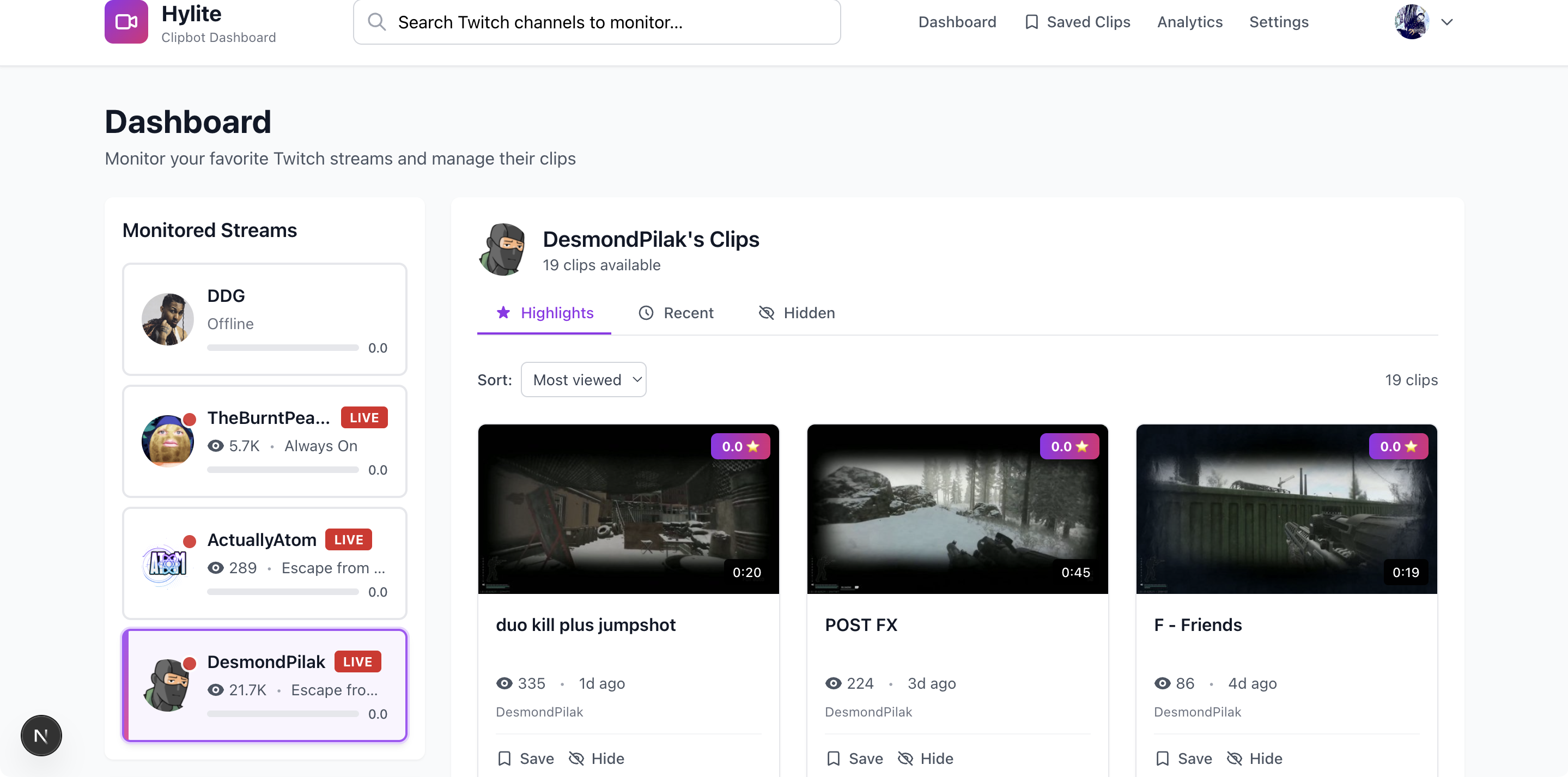 Hylite automatically monitors channels, detects highlights, and organizes clips so you can focus on what matters — the content.